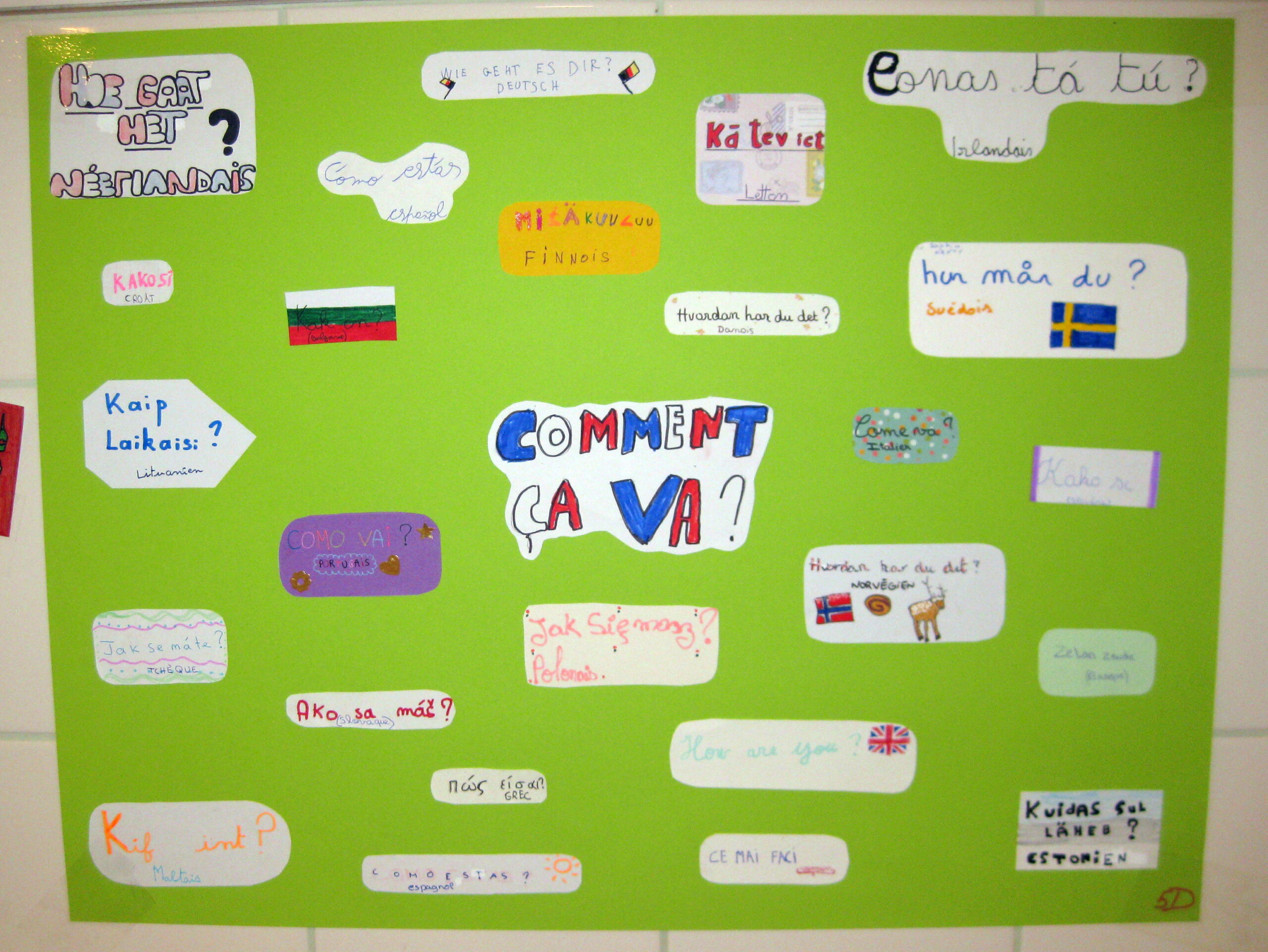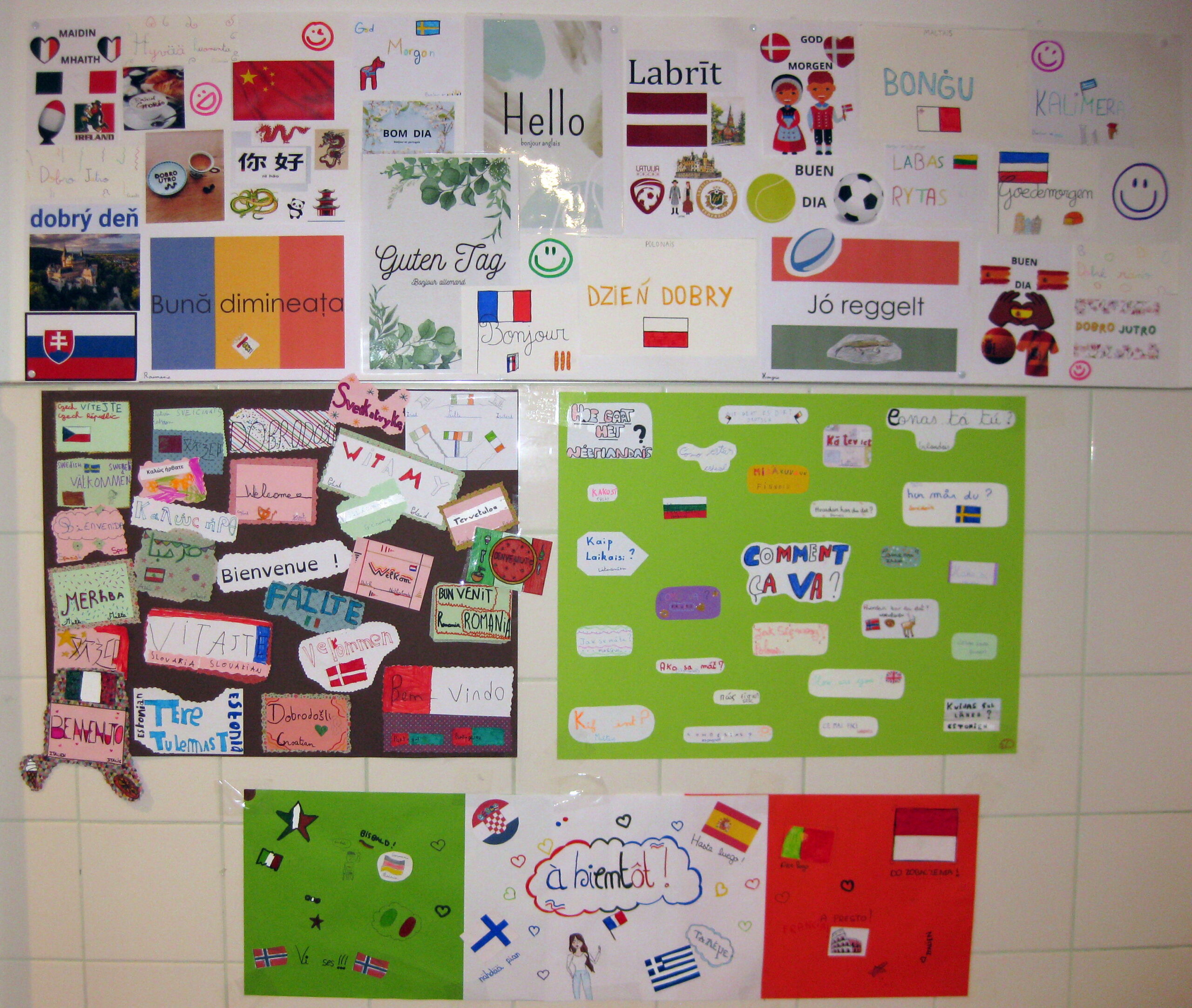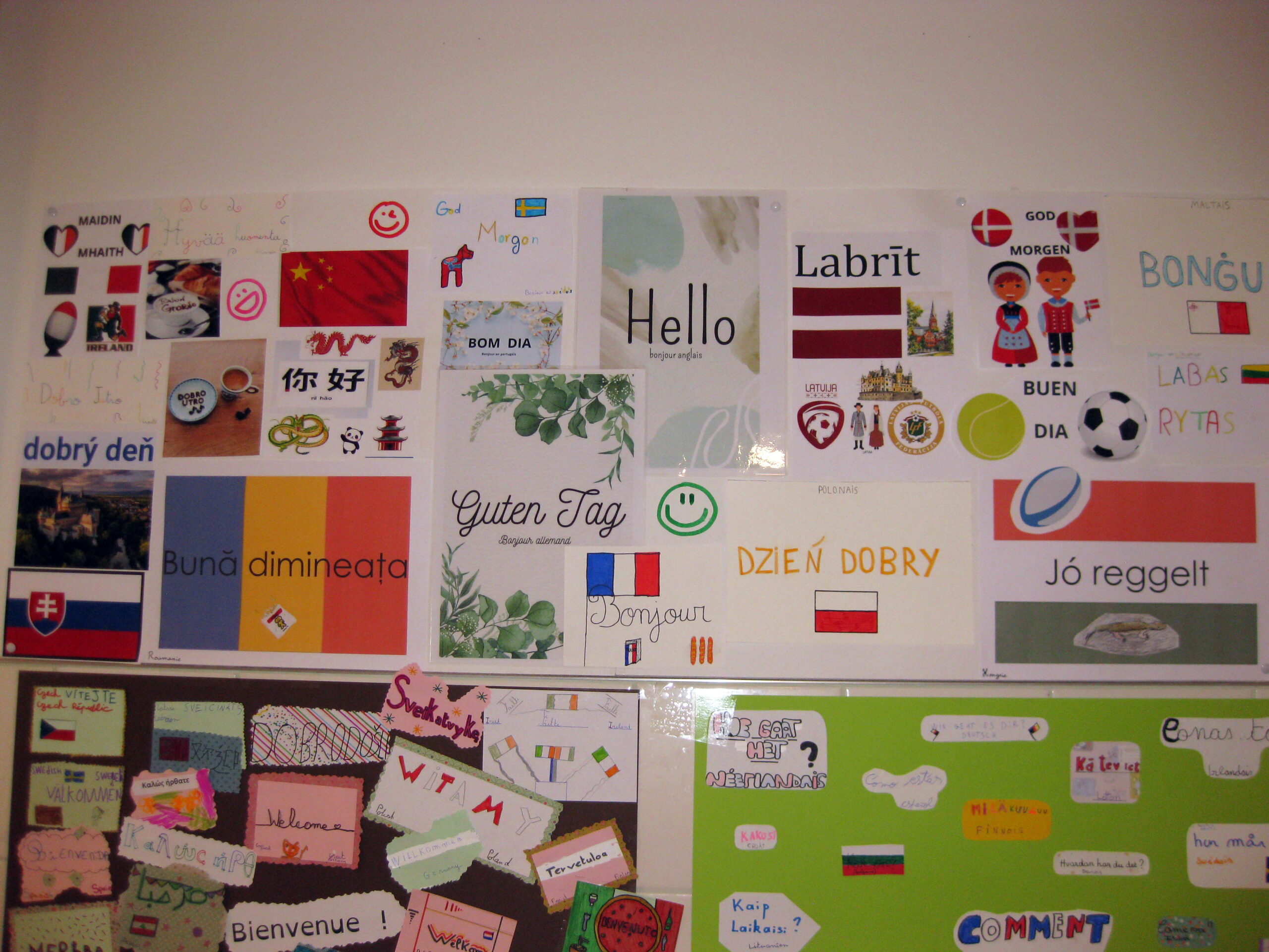 Les élèves ont préparé des affiches présentant des expressions simples du quotidien telles que Bonjour, Au revoir, Merci, Bienvenue, S’il te plaît, Comment ça va ? et À bientôt, traduites dans de nombreuses langues européennes et même internationales. Ces réalisations ont été exposées dans les couloirs du collège, permettant à tous d’élargir leurs connaissances linguistiques.