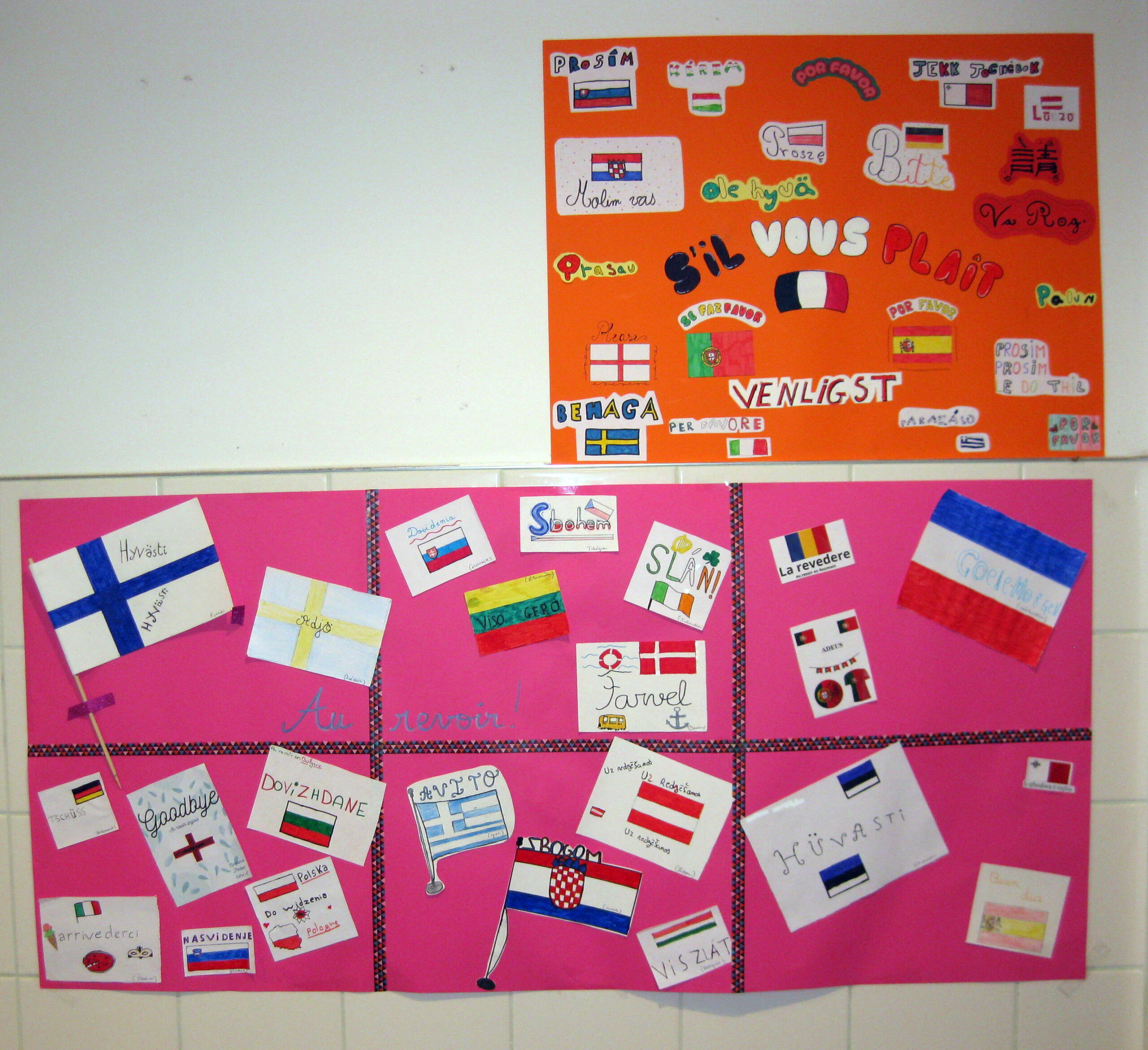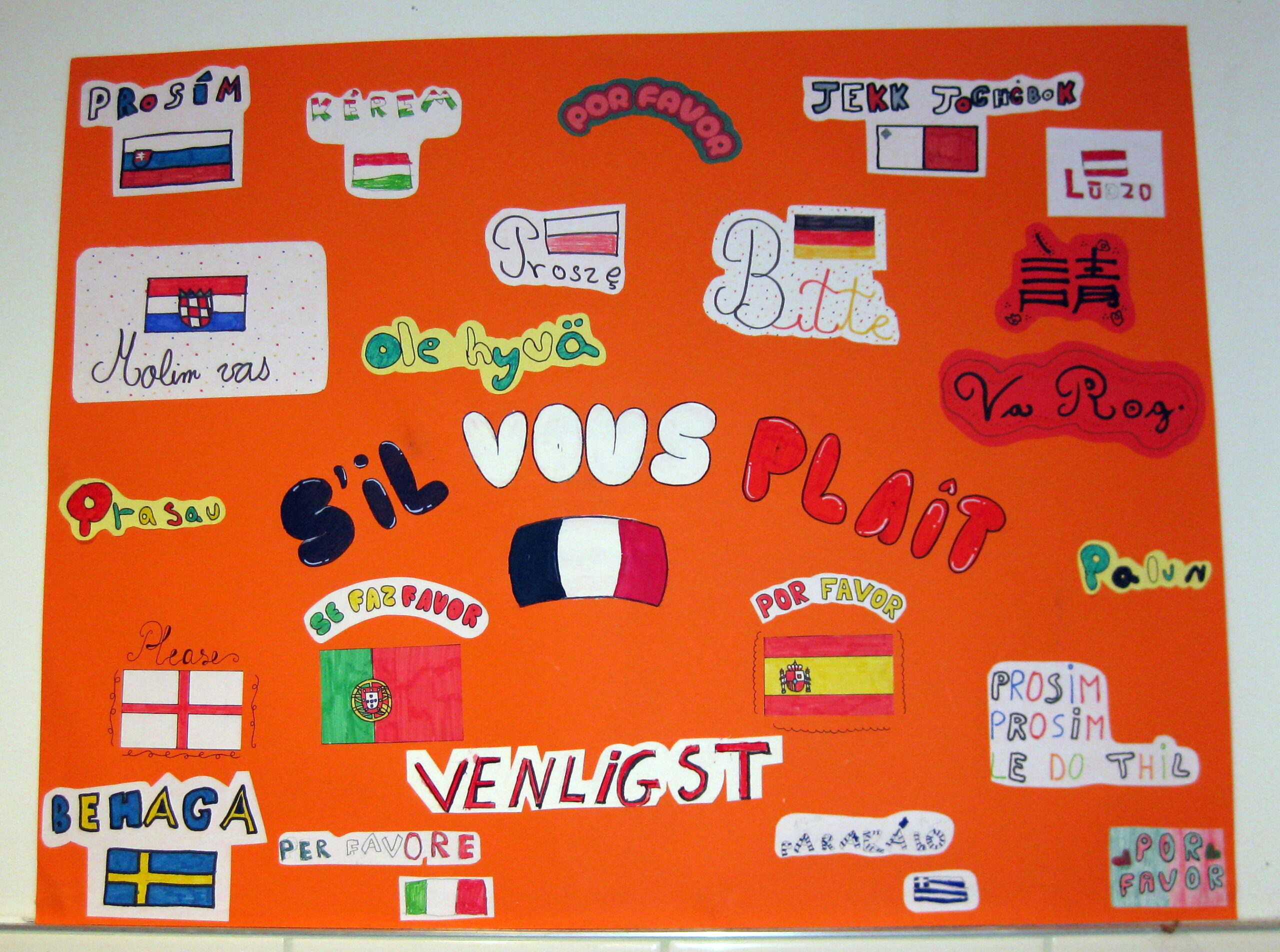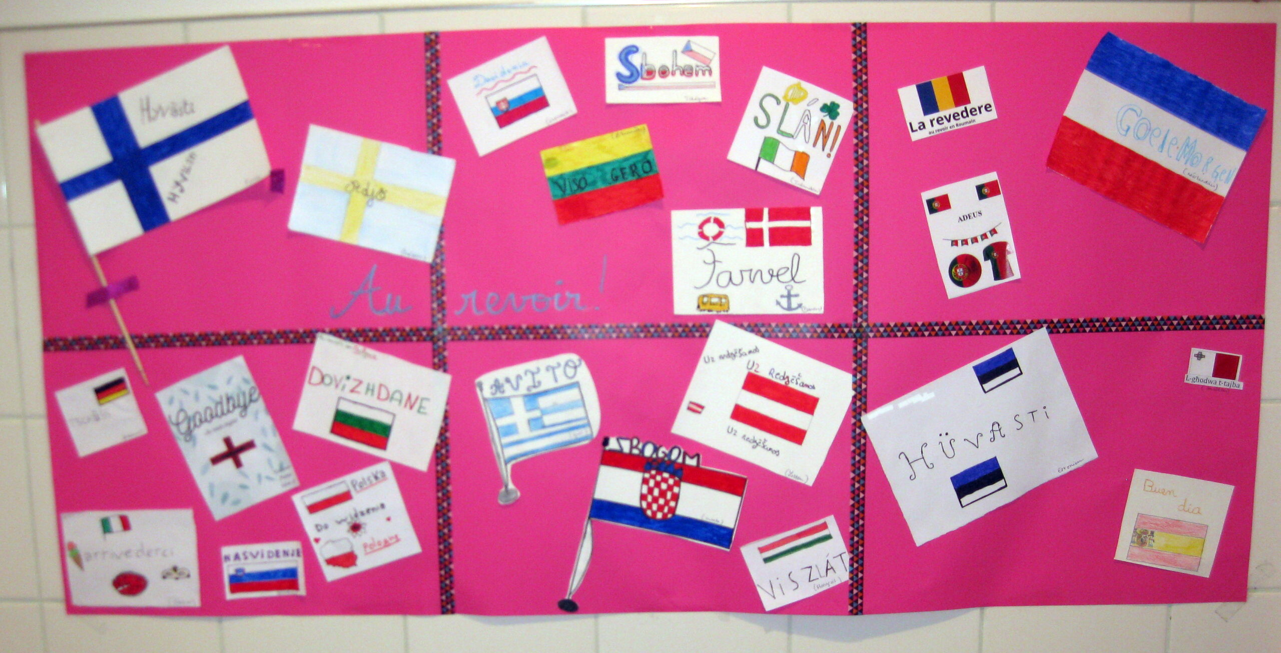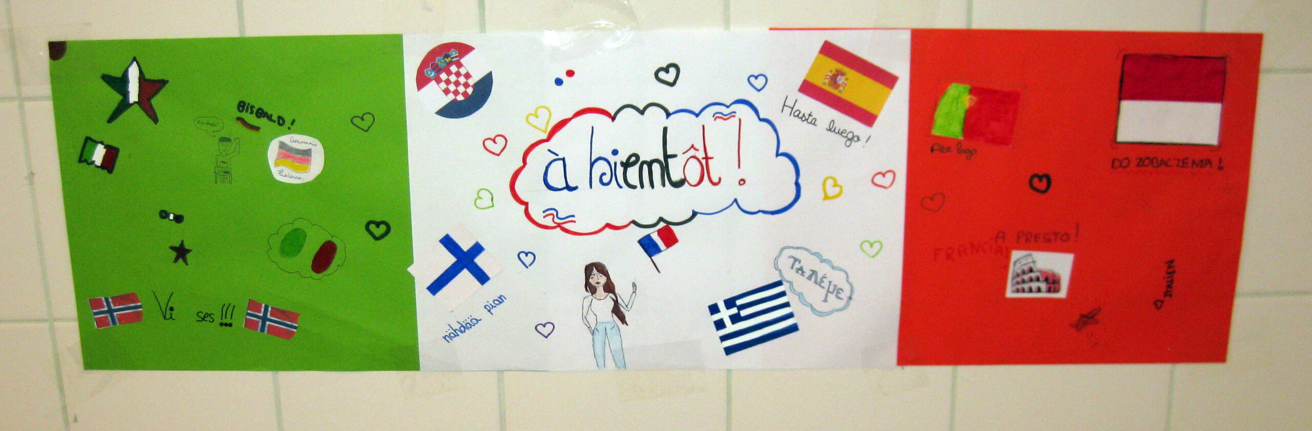 Les élèves ont préparé des affiches présentant des expressions simples du quotidien telles que Bonjour, Au revoir, Merci, Bienvenue, S’il te plaît, Comment ça va ? et À bientôt, traduites dans de nombreuses langues européennes et même internationales. Ces réalisations ont été exposées dans les couloirs du collège, permettant à tous d’élargir leurs connaissances linguistiques.
