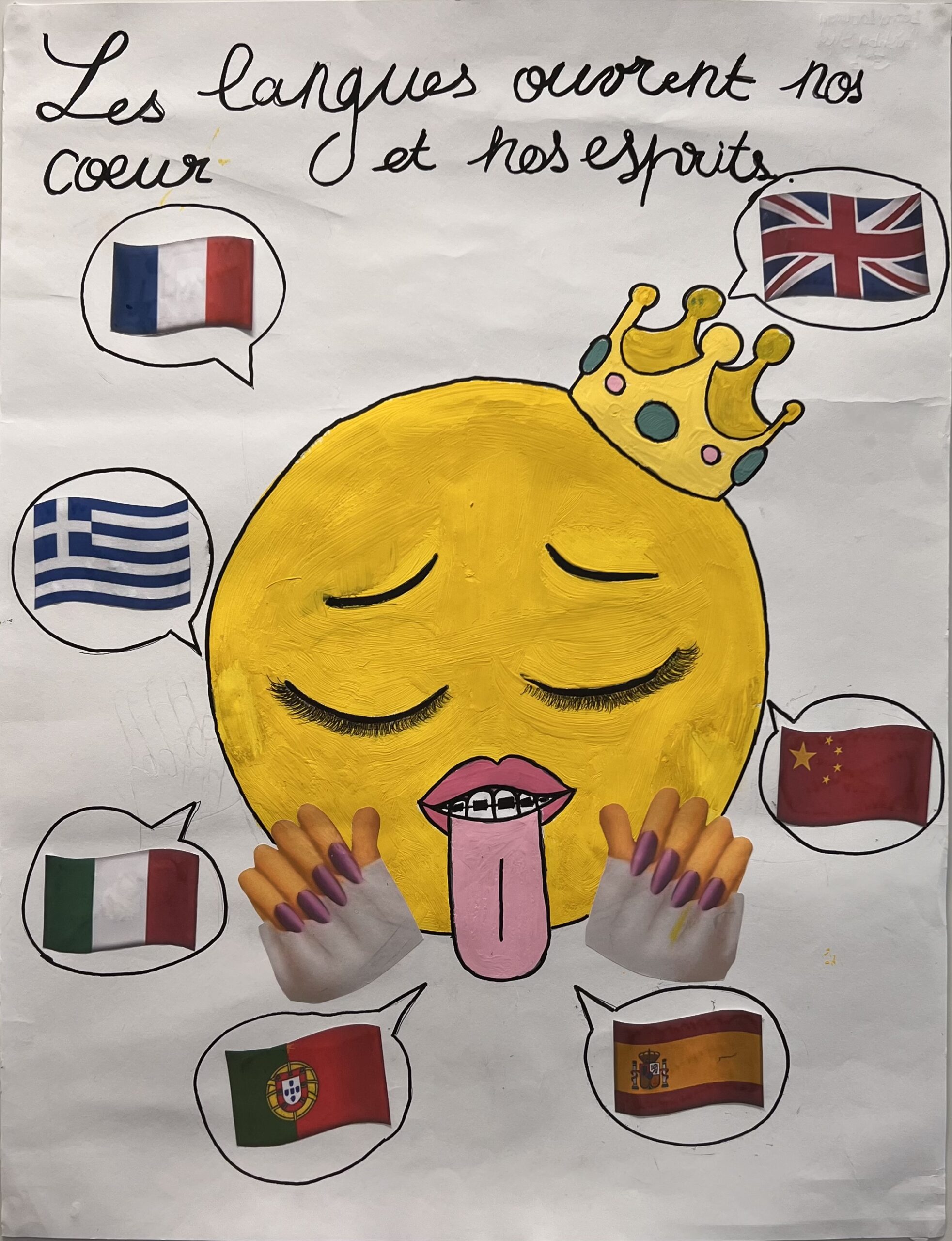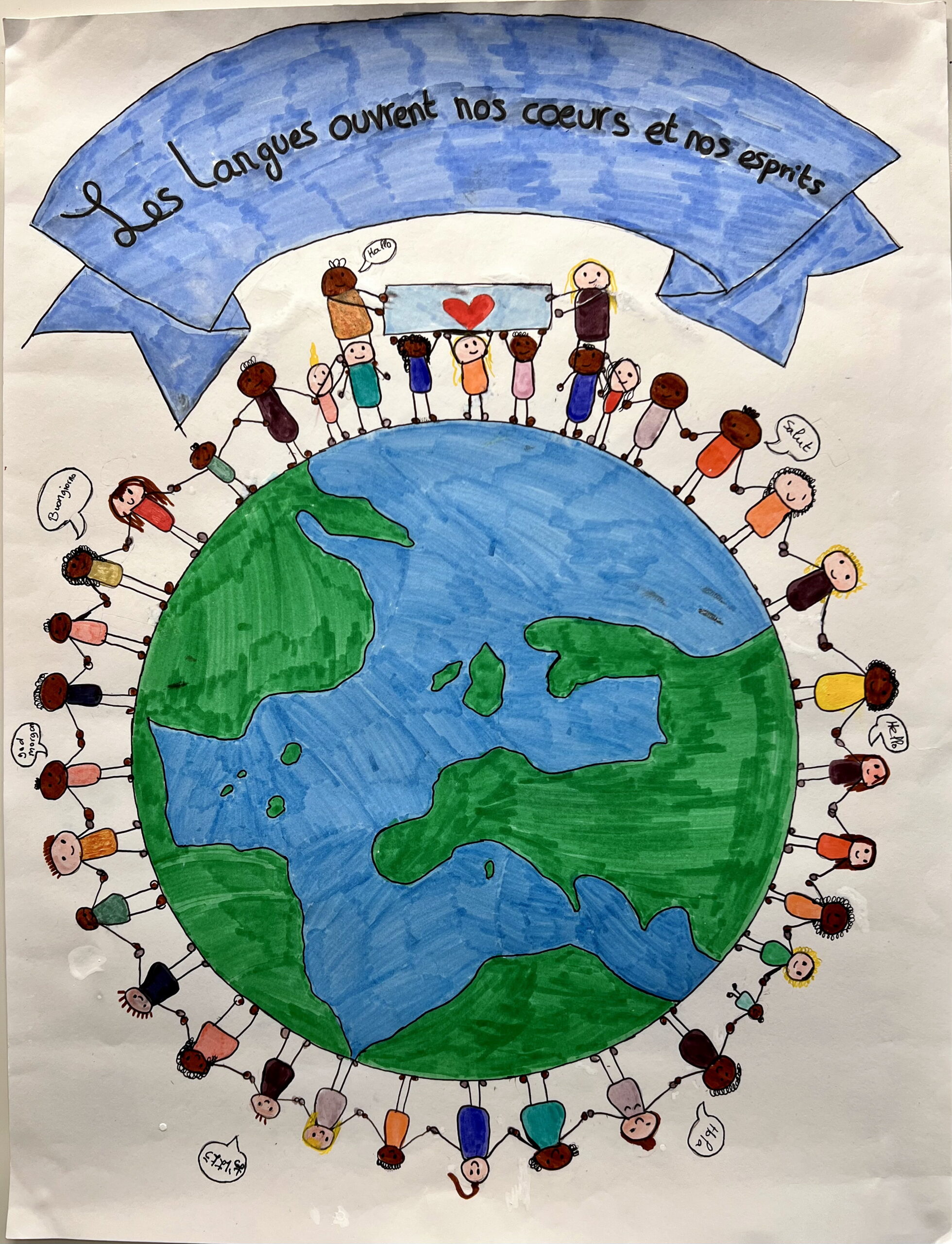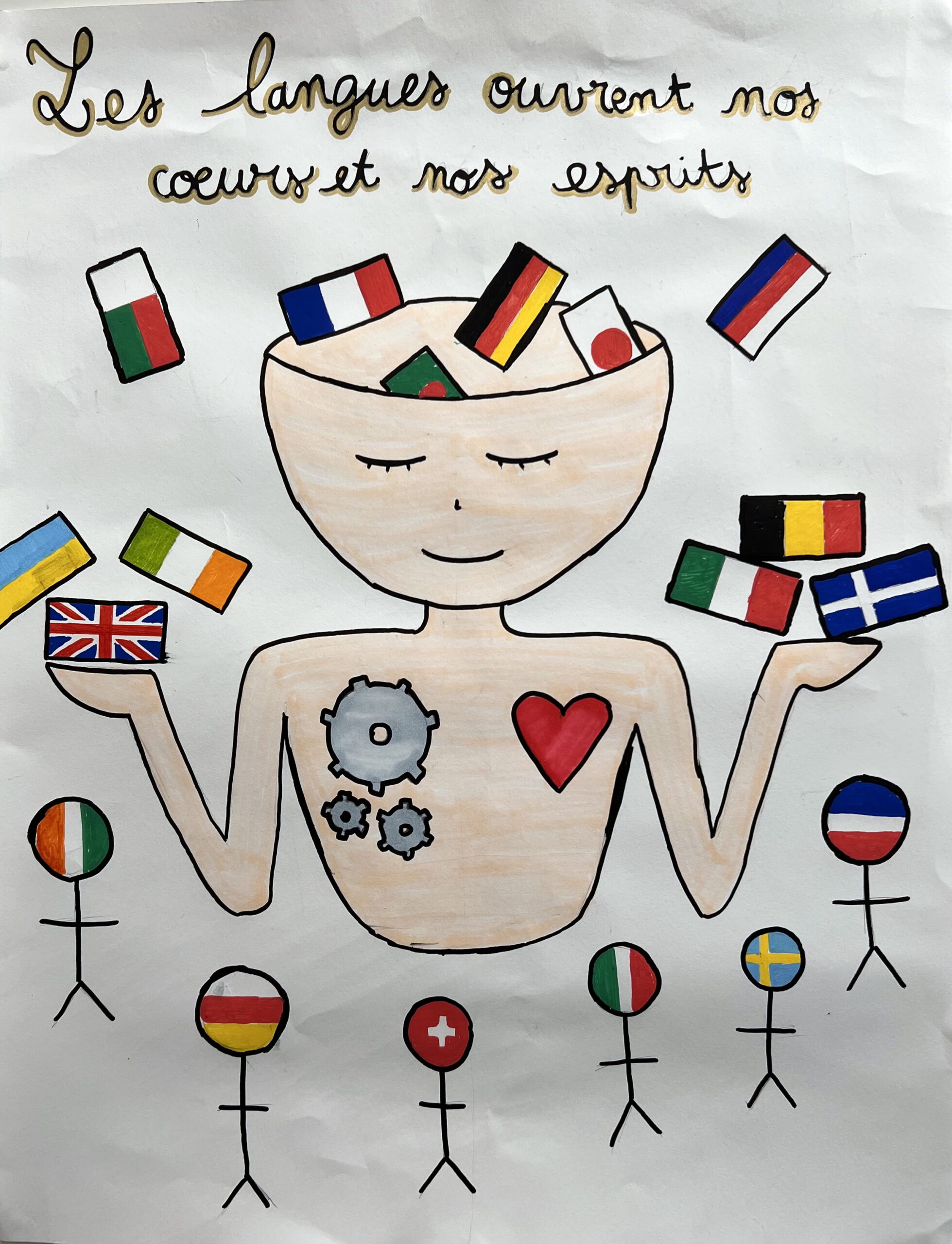 Ce slogan met en valeur le rôle des langues dans le développement à la fois intellectuel et émotionnel, ainsi que leur pouvoir de créer des liens, de favoriser l’échange et de renforcer l’empathie et le respect des différences. Les élèves pouvaient utiliser des symboles, des citations et des œuvres artistiques pour faire passer leur message.